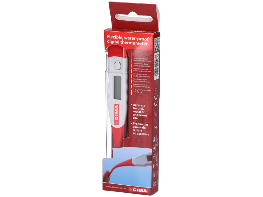 Digitālie termometri GIMA, kuru skala ir °C vai °F, nodrošina precīzu un ātru nolasīšanu. Tie ir droši un vienkārši lietojami, ar lielu un precīzu displeju. Tiem ir šādas īpatnības. Indikācijas diapazons 32,0 °C - 42,0 °С (90.0 °F - 107.6 °F). Precizitāte ± 0,1 °С (± 0,2 °F). Atmiņa: pēdējais rezultāts. Skaņas signalizācijas funkcija. Automātiska izslēgšana. Plastikāta korpuss. Lietotāja instrukcija vairākās valodās. Sertifikāts CE, ar FDA atbalstu. Baterijas LR/4I. 1.5V.