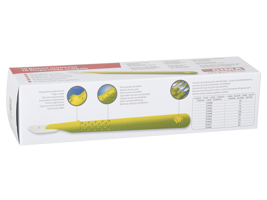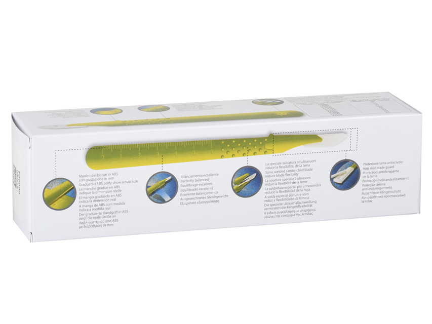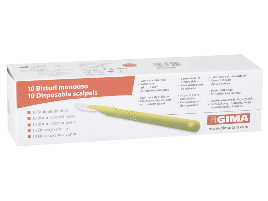 Vienreizlietojamie skalpeļi GIMA.Sterili.Modelis PREMIUM.S/S asmens iebūvēts rokturī no ABS plastmasas.Individuāli iepakoti sterilā aploksnē ar asmens drošības aizsargu.Izturīgs un ērts korpuss no ABS.Lieliski līdzsvaroti.Vairākslāņu asmens, Sonic metinājums.Neslīdošs asmeņa aizsargs.N10.