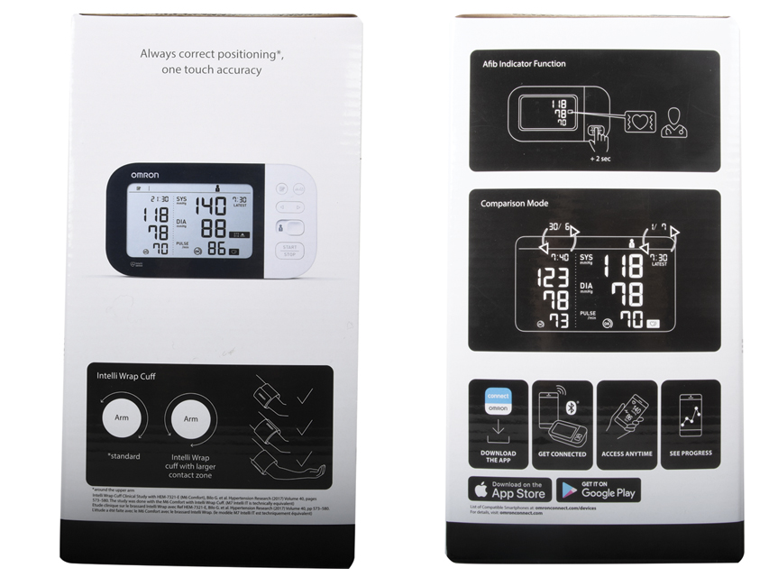 OMRON M7 INTELLI IT - HEM-7361T-EBK ar Intelli Wrap aproci 22-42 cm.• Klīniski apstiprināts: lai pārbaudītu apstiprinājumus, lūdzu, skatiet www.dableducational.org• Intellisense tehnoloģija• Neregulāras sirdsdarbības detektors: AFib• Manžetes aptinuma rokasgrāmata• Intelli Wrap Tehnoloģija (360° precizitāte: precīzi mērījumi no jebkuras pozīcijas ap augšdelmu)• Manšete: Intelli wrap aproce 22-42 cm• Atmiņas mērījums: 100 x 2 lietotāji + viesa režīms• Ķermeņa kustību noteikšana• Vienkāršs augsta asinsspiediena krāsu indikators: signāls gadījumā, ja vērtības pārsniedz EHSstandarti vietējiem automātiskajiem mērījumiem (85 sistoliskais spiediens un/vai 135 diastoliskais spiediens)• Hipertensija• Vidējais pēdējie 3 mērījumi (vidēji 3 pēdējie mērījumi, kas veikti 10 minūšu laikā)• 3 secīgi mērījumi AFib režīmā• Mērījumu salīdzinājums ar iepriekšējiem rādījumiem• App /Bluetooth savienojumsIntellisense™ tehnoloģija nodrošina, ka tiek automātiski noteikts pareizais piepūšanas spiediens.Tā nosaka neregulārus impulsus un automātiski izlemj, vai mērījuma rezultāts ir ticams vai ir jāatkārto.Tiek parādīti tikai precīzi rezultāti.Savienojuma OMRON lietotne ļauj uzraudzīt parametrus, izveidot personalizētas programmas, lejupielādēt un koplietot datus.AFib (priekškambaru mirdzēšanas) noteikšanas funkcija.Daudzvalodu kaste un rokasgrāmata: GB, FR, IT, ES, DE, NL, RU, TR, arābu.Tā nosaka neregulārus impulsus un automātiski izlemj, vai mērījumu rezultāts ir ticams vai ir jāatkārto.Tiek parādīti tikai precīzi rezultāti.Savienojuma OMRON lietotne ļauj pārraudzīt parametrus, izveidot personalizētas programmas, lejupielādēt un koplietot datus.AFib (priekškambaru mirdzēšanas) noteikšanas funkcija .Vairāku valodu kaste un rokasgrāmata: GB, FR, IT, ES, DE, NL, RU, TR, arābu.Tā nosaka neregulārus impulsus un automātiski izlemj, vai mērījumu rezultāts ir ticams vai ir jāatkārto.Tiek parādīti tikai precīzi rezultāti.Savienojuma OMRON lietotne ļauj pārraudzīt parametrus, izveidot personalizētas programmas, lejupielādēt un koplietot datus.AFib (priekškambaru mirdzēšanas) noteikšanas funkcija .Vairāku valodu kaste un rokasgrāmata: GB, FR, IT, ES, DE, NL, RU, TR, arābu.