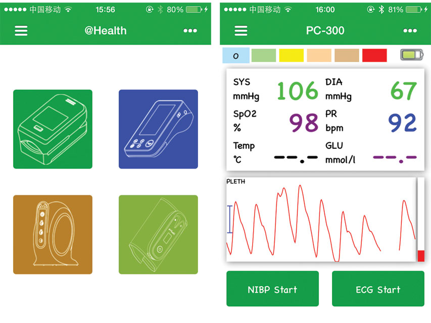PC-300 rokas monitors Spot-check monitors mēra SpO2, pulsa ātrumu, NIBP un TEMP.Plaši izmanto slimnīcās, klīnikās un ģimenes ikdienas mērījumos.Aprīkots ar Bluetooth un USB interfeisu, ļauj pārsūtīt datus uz datoru, planšetdatoriem un viedtālruni (Android un iOS).- līdz 6000 grupām NIBP datu krātuve, līdz 100 dažādiem pacientiem (katrs lietotājs var saglabāt 999 mērījumu ierakstus)- ātra auss zonde TEMP mērījumu rezultāts 5 sekundēs- datu pārsūtīšana uz datoru/viedtālruni, izmantojot USB vai Bluetooth- izvēles NIBP bērnu aproce un SpO2 bērnu zonde- izvēles EKG un glikometrs- iebūvēta uzlādējama litija baterija- sakaru protokoli pieejami pēc pieprasījumaIzmērs: 165 x 96 x 68 mm.6000 NIBP pasākumu atmiņaTehniskās specifikācijasSpO2mērīšanas diapazons: 0-100%Precizitāte: ±3% (70-100%)Pulsa ātrumamērīšanas diapazons: 30-240 sitieni minūtēPrecizitāte*: ±2% vai ±2 sitieni minūtē (atkarībā no tā, kurš no tiem ir lielāks)*Kvadrāta vidējā vērtība no novirzes saskaņā ar ISO 80601-2-61, ISO 9919NIBPSpiediena diapazons: 0-300 mmHg (0-39,9 kpa)Precizitāte: ±3 mmHgMērīšanas diapazons:Sistoliskais spiediens: 30-270 mmHgDiastoliskais spiediens: 20-235mmHg 10-220 mmHgTEMPMērīšanas diapazons: 32-43,0°CPrecizitāte: ±0,2°C (36-39°C) - ±0,3°C (cits)Mērīšanas laiks: