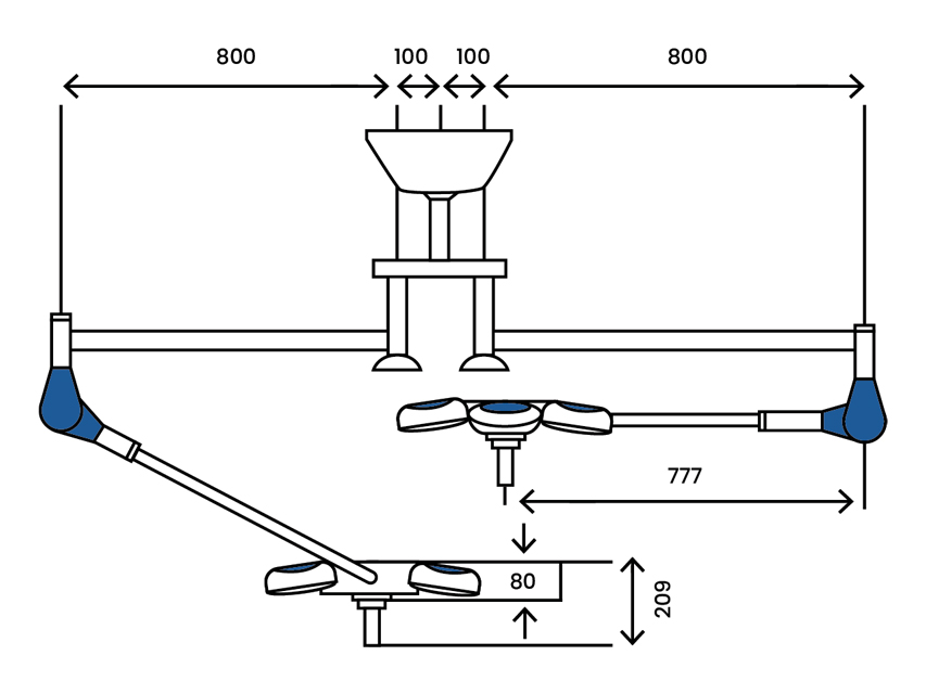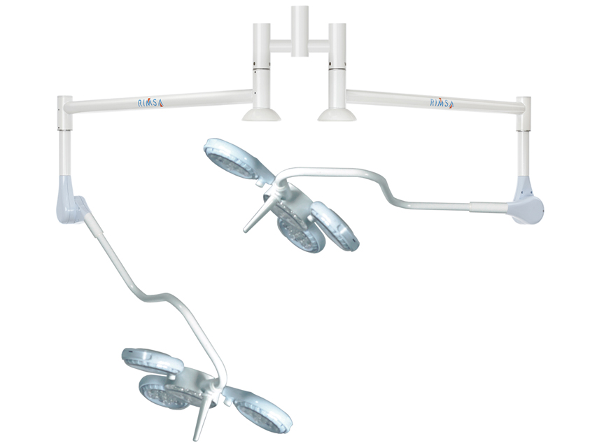 Quattroluci Led light double - ceiling (ceiling >3.58 m needs 30788)Aerodynamic design, extremely handy structure, high technology, quality and performance in one lamp. The multicircular reflector, designed to light up the work area thoroughly and suppress all the shadows, is equipped with handy side handles to facilitate positioning.The ultra-flat lighting body is equipped with ultra-resistant polycarbonate screen, which guarantees protection against possible accidental collisions. Its rotation on 4 axes facilitates positioning.The dome consists of 36 LED lenses arranged radial fashion on 4 module of 9 LED each, to ensure light continuity even in the rare case of individual LED fault.Light intensity is 160,000 lux.Adjustable focalization and light field diameter.Excellent for oral and maxillofacial surgery and aesthetic plastic surgery.QR manual: GB, FR, IT, ES, PT.Made in Italy.