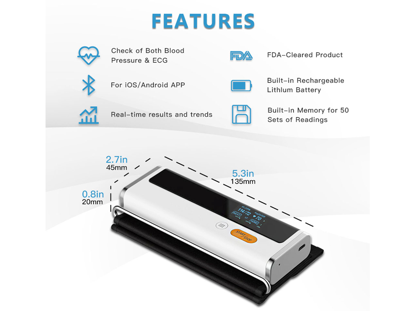 ARMFIT+ ASINSSPIEDIENA MĒRĪTĀJS AR EKG.Armfit+ ir paredzēts reāllaika EKG un asinsspiediena izmaiņu uzraudzībai, mērīšanai, attēlošanai, pārskatīšanai un saglabāšanai mājas apstākļos vai veselības aprūpes iestādēs.EKG var ierakstīt tikai bez kabeļa.Iebūvētais Bluetooth bezvadu savienojums ļauj kopīgot mērījumu ierakstus ar mobilajiem tālruņiem un planšetdatoriem.Komplektācijā: viena pieaugušo manžete, uzlādes kabelis, ātrā rokasgrāmata un daudzvalodu rokasgrāmata GB, FR, IT, ES, DE.Tehniskās specifikācijas.Asinsspiediena mērīšana.Tehnoloģija: Oscilometriskā metode.Spiediena mērīšanas diapazons: 0-300 mmHg.Precizitāte: ± 3 mmHg.Pulsa ātruma diapazons: 40 līdz 200 /min.Pulsa ātruma precizitāte: ±2 /min.Klīniskā precizitāte: atbilst IEC80601-2-30.Asinsspiediena ieraksti: 5.EKG ierakstīšana.Vada veids: Integrēti EKG elektrodi.Pievadu komplekts: Pievads I, Pievads II, Krūškurvja vads.EKG mērījums: 30 s ieraksts.Sirdsdarbības diapazons: 30-250/min ±2 /min.EKG ieraksti: 10.Ierīces.Ierīces izmērs: 135×45×20 mm.Svars (galvenā ierīce): 240 g.Manžetes izmērs: Pieaugušo manžete: 22-42 cm.Bezvadu: Iebūvēts Bluetooth 4.0.Uzlādes ieeja: Micro USB, DC5V.Akumulatora tips: Uzlādējams litija polimērs.Baterijas darbības laiks: 500 mērījumi.Uzlādes laiks: 2 stundas.Klasifikācijas.Aizsardzība: tips BF.Putekļu un ūdens izturība: IP22.Normas: EN 60601-1-2.