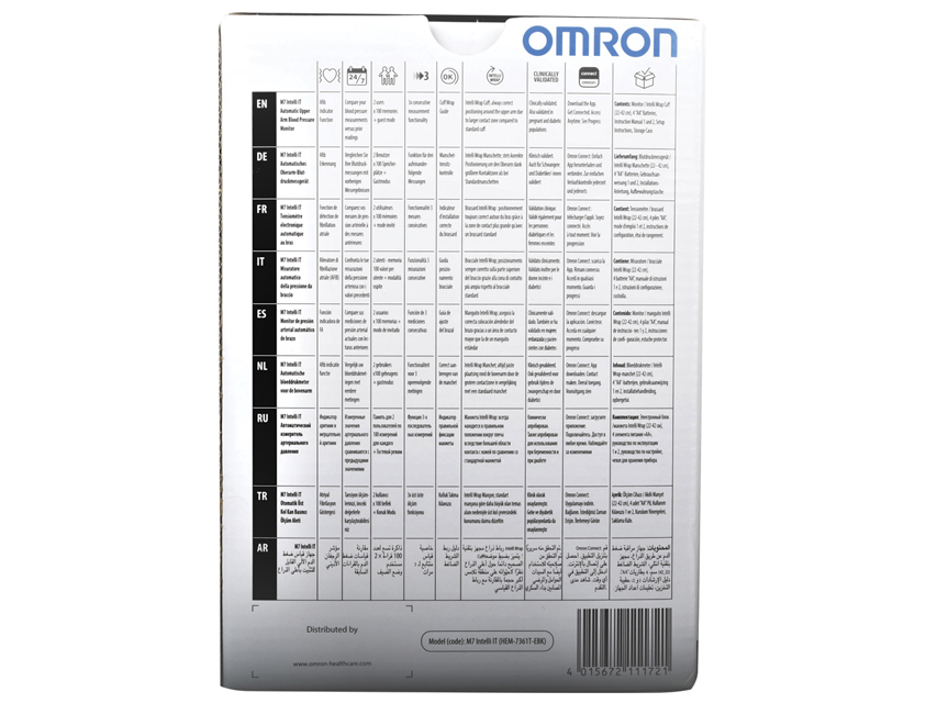 OMRON M7 INTELLI IT - HEM-7361T-EBK ar Intelli Wrap aproci 22-42 cm.• Klīniski apstiprināts: lai pārbaudītu apstiprinājumus, lūdzu, skatiet www.dableducational.org• Intellisense tehnoloģija• Neregulāras sirdsdarbības detektors: AFib• Manžetes aptinuma rokasgrāmata• Intelli Wrap Tehnoloģija (360° precizitāte: precīzi mērījumi no jebkuras pozīcijas ap augšdelmu)• Manšete: Intelli wrap aproce 22-42 cm• Atmiņas mērījums: 100 x 2 lietotāji + viesa režīms• Ķermeņa kustību noteikšana• Vienkāršs augsta asinsspiediena krāsu indikators: signāls gadījumā, ja vērtības pārsniedz EHSstandarti vietējiem automātiskajiem mērījumiem (85 sistoliskais spiediens un/vai 135 diastoliskais spiediens)• Hipertensija• Vidējais pēdējie 3 mērījumi (vidēji 3 pēdējie mērījumi, kas veikti 10 minūšu laikā)• 3 secīgi mērījumi AFib režīmā• Mērījumu salīdzinājums ar iepriekšējiem rādījumiem• App /Bluetooth savienojumsIntellisense™ tehnoloģija nodrošina, ka tiek automātiski noteikts pareizais piepūšanas spiediens.Tā nosaka neregulārus impulsus un automātiski izlemj, vai mērījuma rezultāts ir ticams vai ir jāatkārto.Tiek parādīti tikai precīzi rezultāti.Savienojuma OMRON lietotne ļauj uzraudzīt parametrus, izveidot personalizētas programmas, lejupielādēt un koplietot datus.AFib (priekškambaru mirdzēšanas) noteikšanas funkcija.Daudzvalodu kaste un rokasgrāmata: GB, FR, IT, ES, DE, NL, RU, TR, arābu.Tā nosaka neregulārus impulsus un automātiski izlemj, vai mērījumu rezultāts ir ticams vai ir jāatkārto.Tiek parādīti tikai precīzi rezultāti.Savienojuma OMRON lietotne ļauj pārraudzīt parametrus, izveidot personalizētas programmas, lejupielādēt un koplietot datus.AFib (priekškambaru mirdzēšanas) noteikšanas funkcija .Vairāku valodu kaste un rokasgrāmata: GB, FR, IT, ES, DE, NL, RU, TR, arābu.Tā nosaka neregulārus impulsus un automātiski izlemj, vai mērījumu rezultāts ir ticams vai ir jāatkārto.Tiek parādīti tikai precīzi rezultāti.Savienojuma OMRON lietotne ļauj pārraudzīt parametrus, izveidot personalizētas programmas, lejupielādēt un koplietot datus.AFib (priekškambaru mirdzēšanas) noteikšanas funkcija .Vairāku valodu kaste un rokasgrāmata: GB, FR, IT, ES, DE, NL, RU, TR, arābu.