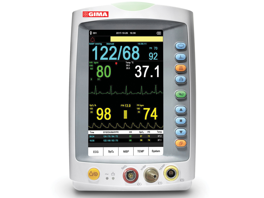 Vital Signs ir nelielu daudzparametru pacientu monitoru sērija, kas paredzēta vitālo fizioloģisko parametru uzraudzībai: neinvazīvs asinsspiediens (NIBP), skābekļa piesātinājums (SpO₂), elektrokardiogramma (EKG) un temperatūra (TEMP).Īpašības7” augstas izšķirtspējas skārienjūtīgs displejsVēsturisko datu apskate viļņveida attēlojumā, saraksta formā un tendenču grafikāUSB pieslēgvieta datu eksportēšanai un programmatūras atjaunināšanaiTehniskā specifikācijaNIBPMērīšanas metode: oscilometriskāMērīšanas režīmi: Manual (manuālais), Auto (automātiskais), STATMērīšanas diapazons:Sistoliskais spiediens (SYS), mmHg:Pieaugušajiem 40–275Bērniem 40–200Jaundzimušajiem 40–135Vidējais arteriālais spiediens (MAP), mmHg:Pieaugušajiem 20–230Bērniem 20–165Jaundzimušajiem 20–110Diastoliskais spiediens (DIA), mmHg:Pieaugušajiem 10–210Bērniem 10–150Jaundzimušajiem 10–95SpO₂Mērījumu diapazons: 35–100%Precizitāte: ±3% diapazonā no 70% līdz 100%Darbība pie zemas perfūzijas: līdz 0,4%PulssMērīšanas diapazons: 30–240 sit./minPrecizitāte: ±2 sit./min vai ±2% (ņem vērā lielāko vērtību)EKGSirdsdarbības frekvences displeja diapazons: 15–130 sit./minDispleja precizitāte: ±1% vai ±2 sit./min (ņem vērā lielāko vērtību)Trauksmes aizkaves laiks: ≤10 sJutības izvēle: x1/4, x1/2, x1, x2Slaucīšanas ātrums: 25 mm/sTemperatūraMērīšanas diapazons: 21–50 °CPrecizitāte: ±0,2 °C diapazonā 25–45 °CCitas tehniskās specifikācijasBarošana: 100–240 VAC, 50/60 HzAkumulators: 11,1 V, 4400 mAh (litija jonu)Standarta komplektācijaPieaugušo SpO₂ zondeNIBP manšete pieaugušajiemTemperatūras zonde (ādas tipa)EKG kabelis + 10 EKG elektrodu komplektsLitija uzlādējamais akumulatorsBarošanas kabelisAizsargpārvalks pret putekļiem