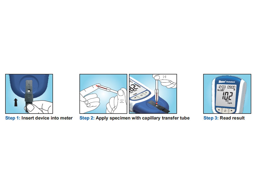 Analizators MISSION® nodrošina augstu kvalitāti un drošus rezultātus pilnai Lipīdu paneļa testēšanai 45 sekunžu laikā. 3 vienā. Pilni testi Lipīdu panelim: kopējam holesterīnam (CHOL), augsta blīvuma lipoproteīnam (HDL) un triglicerīdiem (TRIG). Tiek iekļauti aprēķinu testi: zema blīvuma lipoproteīns (LDL), CHOL/HDL attiecība un sirds riska novērtējums. Drošs. Var testēt neatšķaidītas asinis, serumu vai plazmu. Plašs hematokrīta diapazons: 0-50%. Mazs printeris tūlītējai rezultātu drukāšanai. Viegli izmantojams. Liels šķidro kristālu displejs ērtai nolasīšanai. Testeri ar krāsu kodējumu un iegravētu testa nosaukumu vienkāršai identificēšanai. Barošana no baterijas. Komplektā ietilpst 5 drošības lancetes, 2 vadības ierīces, 4 baterijas, apvalks un rokasgrāmata (GB, IT). Daudzvalodu interfeiss: GB, FR, IT, ES, DE, PT, PL, SE, FI, GR, CZ, RO, BG, RU, SA. Tehniskie parametri: Atklāšanas metode: atspoguļojošā fotometrija. Laiks līdz rezultātu saņemšanai: 45 sekundes ... 2 minūtes. Atmiņa ar datumu/laiku 200 rezultātiem. Izmēģinājuma tips: kvantitatīvais. Testi: CHOL, HDL, TRIG. Aprēķinu testi: LDL, CHOL/HDL attiecība un sirds riska novērtējums. Paraugu apjoms: 3 vienā Lipīdu paneļa ierīce: 35 mkl. Individuālā testa ierīce CHOL: 10 mkl. Mērvienības: mg/dl vai mol/l. Mērījumu diapazons: CHOL: 100-500 mg/dl (2,59-12,93 mol/l). HDL: 15-100 mg/dl (0,39-2,59 mol/l). TRIG: 45-650 ml/dl (0,51-7,34 mol/l). Interfeiss datu pārraidei: ports Mini USB. Kalibrēšana: Koda čips. Valodas uz ekrāna: angļu abreviatūras. Barošanas avots: 4 ААА vai maiņstrāvas adapters (Mini USB, 5 B pa, 50 mА). Baterijas kalpošanas ilgums: = 1000 testi. Automātiska atslēgšana: 5 minūtes. Mērītāja izmēri: 137 × 79 × 26 mm. Displeja izmēri: 50 × 50 mm. Svars bez baterijām: 145 g.
